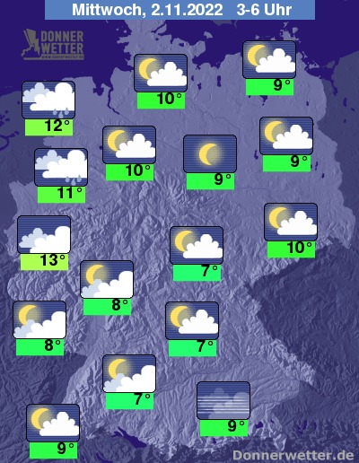 In der Nacht zum Mittwoch ist es anfangs überwiegend nur locker bewölkt, oft auch sternenklar. Von Westen her nimmt die Bewölkung jedoch rasch zu und nach Mitternacht sind vom Niederrhein bis ins Emsland einzelne Schauer möglich. Weiter nach Osten hin bleibt es bei überwiegend lockerer Bewölkung trocken. Die Temperatur sinkt auf 13 Grad in Düsseldorf und etwa 7 Grad in Nürnberg. Im Nordwesten weht ein zunehmend starker bis stürmischer Wind, an der Nordsee herrscht verbreitet Sturm.