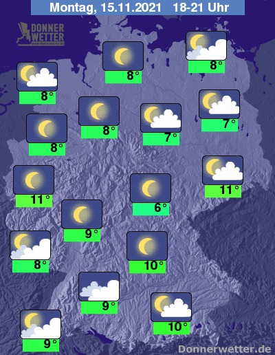 Heute Abend kann sich der Himmel insgesamt weiter auflockern bzw. aufklaren. Viele und teils dichte Wolken halten sich im Ostseeumfeld und im Südosten des Landes. Im übrigen Land ist es verbreitet nur locker bewölkt oder sternenklar, dazu bleibt es trocken. Die Temperatur liegt bei 6 Grad in Erfurt und 11 Grad in Köln.