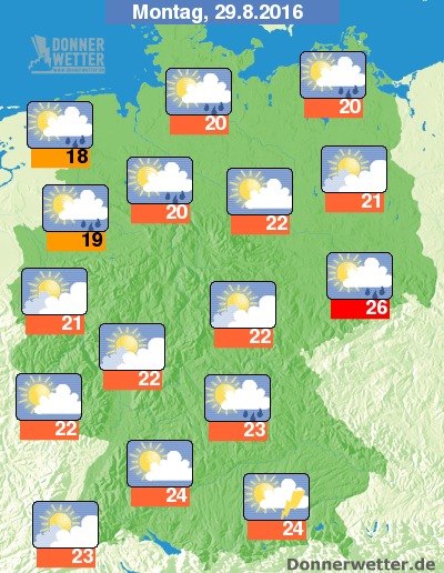 Am Montag ist es vor allem im Alpenvorland häufig stark bewölkt und es bilden sich zeitweise Schauer sowie teils kräftige Gewitter. In einem sehr breiten Streifen vom Südwesten bis in den Osten des Landes ist es verbreitet heiter oder aufgelockert bewölkt und weitgehend trocken. Dagegen ziehen nordwestlich einer Linie von südlichen NRW bis nach Nordbrandenburg oft auch dichte Wolken durch, die für einzelne Schauer sorgen. Die Temperatur steigt auf 18 Grad an der Nordsee und bis 26 Grad in der Lausitz.
