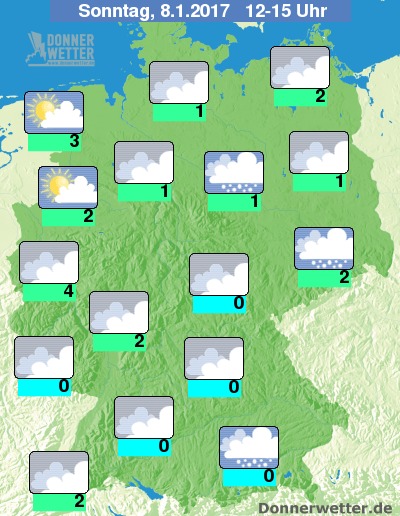 Heute Abend lockert es im Umfeld von Nord- und Ostsee meist auf, im übrigen Land ist es verbreitet stark bewölkt oder neblig-trüb, jedoch fällt nur selten Schnee, Schneeregen oder Regen. Die Abendtemperatur liegt zwischen 0 und 4 Grad.