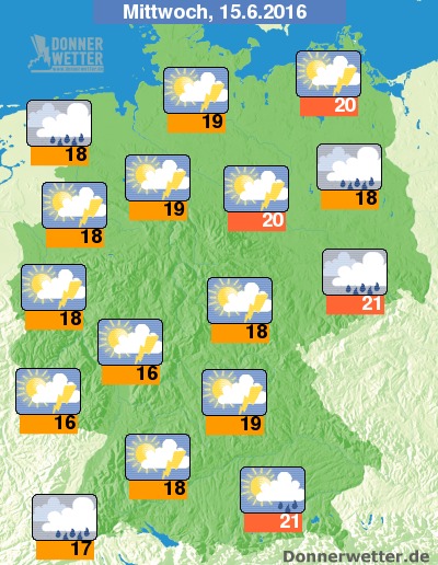 Am Mittwoch ziehen neben heiteren Abschnitten häufig dichte Wolken durch und es können sich verbreitet Schauer, nicht selten auch Gewitter entwickeln. Örtlich muss auch mit kräftigem und ergiebigem Regen gerechnet werden. Die Temperatur steigt auf 16 Grad am Taunus und bis 21 Grad in Leipzig.
