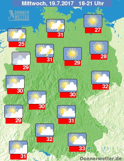 Heute Abend ziehen in den Nordwesten und Westen zunehmend auch dichte Wolken, dabei sind einzelne Schauer und lokal auch Gewitter möglich. Im übrigen Bundesgebiet bleibt es weitgehend leicht bis wechselnd bewölkt und trocken. Die Temperatur bewegt sich bei sommerlichen 25 Grad in Bremerhaven und heißen 33 Grad in München.