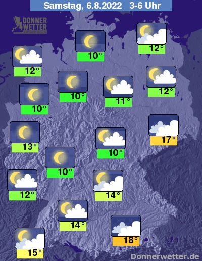 In der Nacht zum Samstag zeigt sich der Himmel über der Nordwesthälfte Deutschlands weitgehend sternenklar. Dichte Wolken halten sich dagegen über Sachsen und dem Südosten der Republik, dabei bilden sich einzelne Schauer, aber nur selten auch Gewitter. Im übrigen Land ist es teils stark, teils aufgelockert bewölkt, aber trocken. Die Temperatur sinkt auf 18 Grad in München und rund 10 Grad in Hannover.