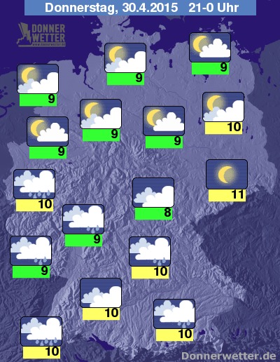 Heute Abend bleibt es in der Südhälfte Deutschlands weitgehend bedeckt und es fällt immer wieder Regen, weiter nach Norden hin ist es dagegen teils aufgelockert, teils stark bewölkt, dabei bilden sich nur vereinzelte Schauer. Die Abendtemperatur liegt bei 11 Grad in Görlitz und um 8 Grad im Coburger Land.