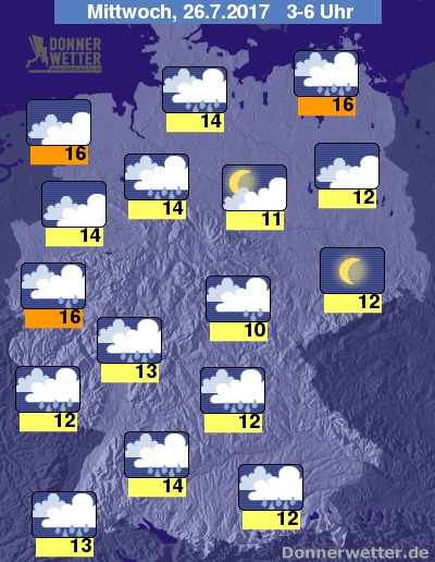 In der Nacht zum Mittwoch zeigt sich der Himmel über Sachsen meist sternenklar, über Berlin-Brandenburg und Sachsen-Anhalt ist es meist aufgelockert, teils auch stark bewölkt, jedoch weitgehend trocken. Im großen Rest der Republik bleibt die Wolkendecke weitestgehend verschlossen und es fällt teils kräftiger, langanhaltender und auch ergiebiger Regen. Die Temperatur sinkt auf 16 Grad in Rostock und bis etwa 10 Grad im Thüringer Becken.