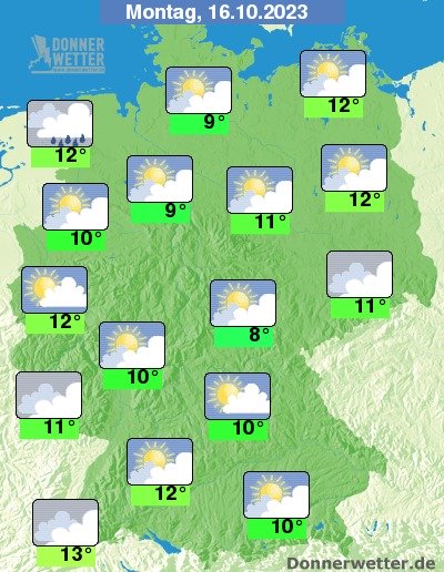 In der Nacht zum Montag ist der Himmel verbreitet nur locker bewölkt oder sogar sternenklar. Im Norden ziehen jedoch oft auch dichte Wolken durch und es können sich vor allem im Küstenumfeld einzelne Schauer bilden. Im übrigen Land bleibt es trocken. Die Temperatur sinkt auf 8 Grad in Cuxhaven und 0 Grad in Erfurt.