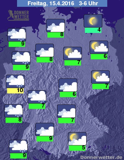 In der Nacht zum Freitag ist es im Norden und Osten zunächst sternenklar oder locker bewölkt, über der Südwesthälfte ist es schon meist dicht bewölkt und zunächst fällt im Südwesten zeitweise Regen, der sich im Nachtverlauf nordostwärts ausbreitet und gegen Morgen etwa einen Streifen von Schleswig-Holstein bis zum westlichen Erzgebirge erreicht. Im Osten und Nordosten nimmt die Bewölkung zwar zu, hier bleibt es aber noch weitgehend trocken. Die Temperatur sinkt auf 10 Grad in Aachen und bis 4 Grad in Vorpommern.