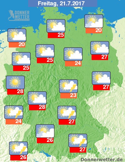 Am Freitag bleibt das Wetter dann vor allem in der Nordhälfte stabil und es scheint verbreitet die Sonne. In der Südhälfte ist hingegen auch am Freitag wieder mit Gewittern im Tagesverlauf zu rechnen.
