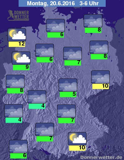 In der Nacht zum Montag klingen auch im Süden die letzten Schauer meist rasch ab, dann ist es fast im gesamten Land weitgehend sternenklar. Im Nordwesten und Westen ziehen gegen Morgen einige meist lockere Wolkenfelder auf, dazu bleibt es trocken. Die Temperatur sinkt auf 12 Grad in Emden und bis 4 Grad am Taunus.