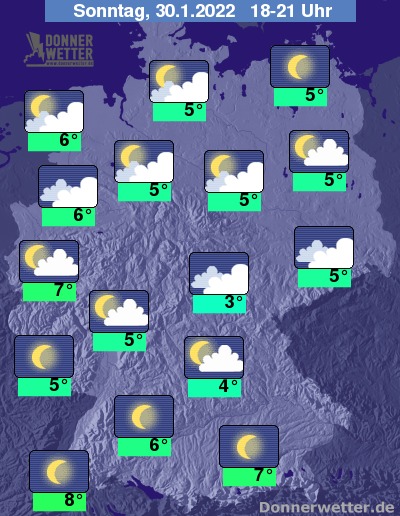 Heute Abend ist der Himmel im Süden und im Nordosten Deutschland verbreitet sternenklar. Im übrigen Land ist es teils locker, zumeist jedoch aufgelockert bis stark bewölkt. Es bleibt landesweit trocken bei Werten von 3 Grad im Vogtland und bis 8 Grad im Breisgau. Im Osten und Norden ist es anfangs noch teils stürmisch, an der Ostsee herrscht zunächst noch teilweise Sturm. Jedoch lässt der Wind im Abendverlauf bereits spürbar nach.