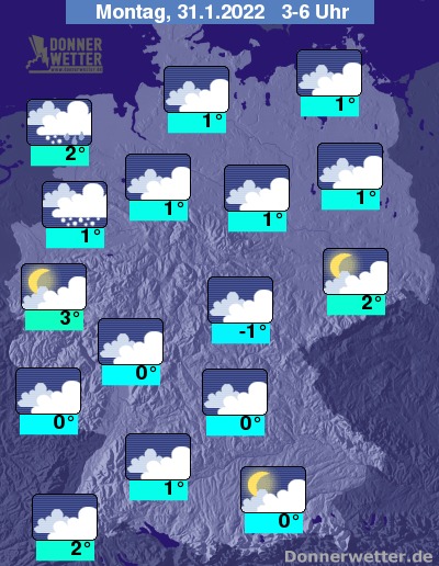 In der Nacht zum Montag ziehen von Nordwesten her zunehmend kompakte Wolken heran, die im Laufe der Nacht zunächst im Nordwesten und Westen Schnee oder Regen bringen. Bis zum Morgen breiten sich Schnee und Regen etwa bis über die Nordwesthälfte des Landes aus. Im übrigen Land verdichtet sich der Himmel ebenfalls, jedoch bleibt es hier weitgehend trocken. Die Temperatur sinkt auf 3 Grad in Köln und bis -1 Grad in Erfurt.