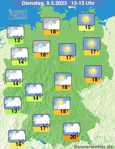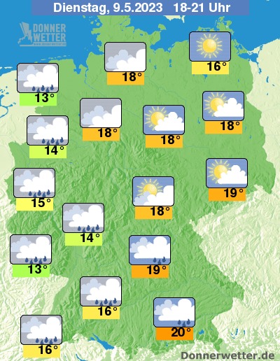 Heute Abend dehnt sich der Regen etwa auf die gesamte Südwesthälfte Deutschlands aus, dabei fällt auch zum Teil langanhaltend Regen. Heiter und sonnig ist es nur noch im Nordosten und im äußeren Osten, sonst nimmt die Bewölkung in den übrigen Landesteilen zu, jedoch bleibt es trocken. Die Temperatur liegt bei 13 Grad in Wilhelmshaven und bis 20 Grad in Berchtesgaden.