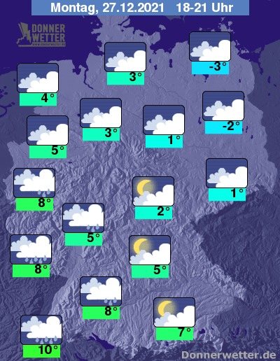 Heute Abend zieht von Südwesten her zeitweiliger Regen auf, der etwa das westliche NRW, Hessen und das westliche Bayern erreicht. Nordöstlich und östlich davon bleibt es bei ebenfalls dichter Bewölkung trocken. Hier und da ist es neblig-trüb. Die Temperatur liegt bei -3 Grad in Neubrandenburg und bis 10 Grad in Freiburg.