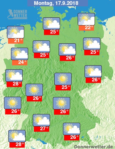 Am Montag bleibt es über der Südhälfte Deutschland weitgehend sonnig, im Norden ziehen hingegen oft viele, zum Teil sogar dichte Wolken durch. Im übrigen Bundesgebiet ist es meist locker bewölkt. Es bleibt landesweit trocken bei Höchstwerten von 21 Grad an der Nordseeküste und bis 28 Grad am Mittel- und Oberrhein.