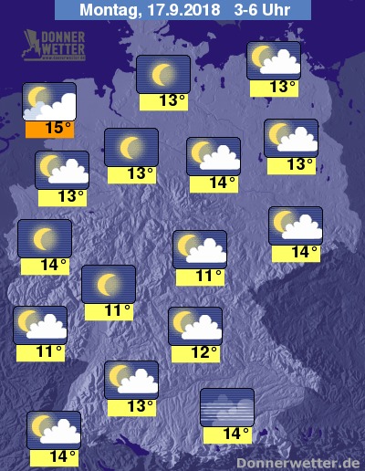 In der Nacht zum Montag können im Nordseeumfeld hier und da dichte Wolken durchziehen, dabei besteht ein leichtes Schauerrisiko, sonst ist es aber verbreitet nur locker bewölkt und vielerorts auch sternenklar, dazu bleibt es trocken. Die Temperatur sinkt auf 15 Grad in Bremerhaven und bis 11 Grad im Thüringer Becken.