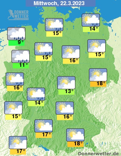 Am Mittwoch zeigt sich der Himmel über der Süd- und Südosthälfte häufig heiter, teils ist es auch sonnig, und es bleibt trocken. Im Westen und Nordwesten nimmt die Bewölkung im Tagesverlauf zu und zeitweise fällt Regen, der bis zum Abend auch die Mitte Deutschlands erreicht. Es weht ein meist mäßiger bis frischer, an der Nordseeküste teils auch stürmischer Südwestwind.
