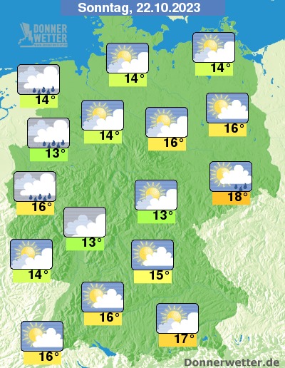In der Nacht zum Sonntag ist es zunächst meist wechselnd bis stark bewölkt, im Norden teils sternenklar, dazu bleibt es weitgehend trocken. In der zweiten Nachthälfte ziehen kompakte Wolken in den Nordwesten und Westen des Landes und es fällt nachfolgend gebietsweise Regen. Die Temperatur sinkt auf 14 Grad in Dresden und 8 Grad in München.