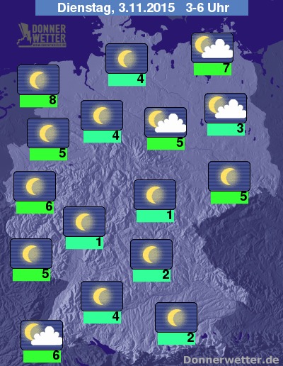 In der bevorstehenden Nacht ziehen nach Nordosten hin noch meist lockere Wolkenfelder durch, im großen Rest des Landes zeigt sich dagegen ein weitgehend sternenklarer Nachthimmel. Hier und da kann sich jedoch Nebel oder Hochnebel bilden. Die Temperatur sinkt auf 8 Grad in Emden und bis 1 Grad am Taunus.