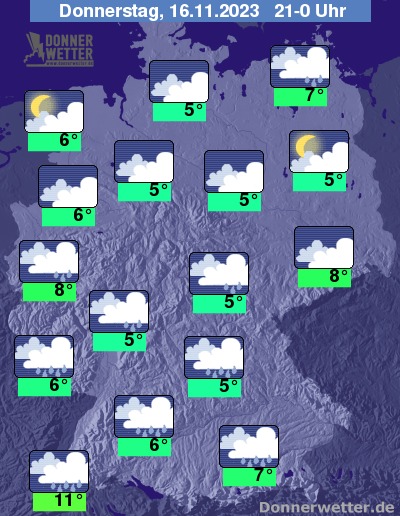 In der Nacht fällt südlich der Eifel und des Mains Regen, im südlichen Bayern und Baden-Württemberg auch anhaltend. Die Schneefallgrenze sinkt in der zweiten Nachthälfte auf 600 bis 800 m. Vorsicht, lokale Glättegefahr! Im äußersten Süden und Südwesten ist zudem mit Sturmböen oder sogar vereinzelten schweren Sturmböen zu rechen. In der Nordhälfte bleibt es bei wechselnder bis starker Bewölkung meist trocken.