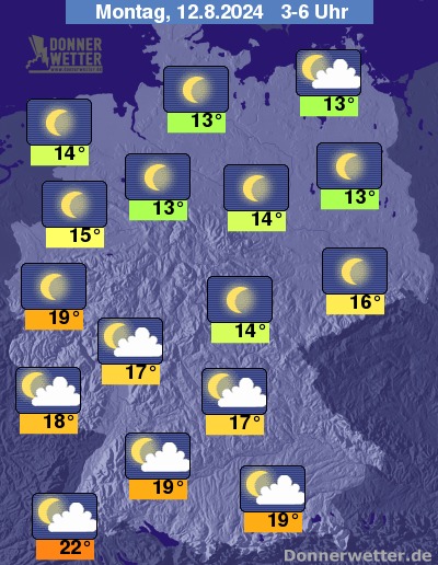 Die Temperaturen gehen in den frühen Morgenstunden zurück auf Werte um 22 Grad im Breisgau und 13 Grad auf Usedom.