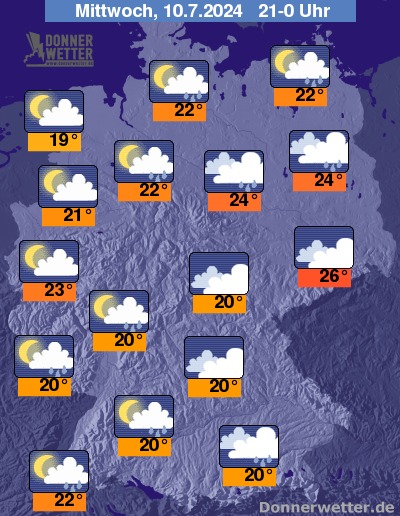In der Nacht zum Donnerstag sind weitere ostwärtsziehende Schauer und Gewitter möglich. Im Westen und Nordwesten lockert es im Nachtverlauf auch zunehmend auf und es bleibt weitgehend trocken.