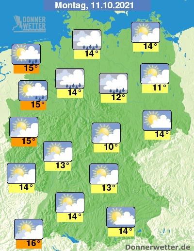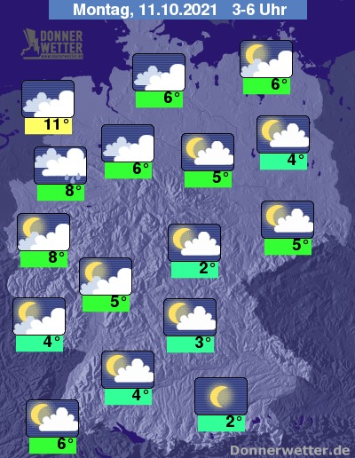 In der Nacht zum Montag ziehen von Nordwesten her zunehmend, zum Teil dichte Wolken auf, die im Norden und Westen örtlich ein paar Tropfen bringen können. Über der Südosthälfte des Landes ist es vor allem in der ersten Nachthälfte noch oft locker bewölkt, im Südosten auch sternenklar, jedoch nimmt die Bewölkung auch hier weiter zu, jedoch bleibt es trocken. Die Temperatur sinkt auf 11 Grad in Bremerhaven und bis 2 Grad in München.
