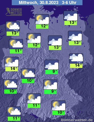 In der folgenden Nacht fällt im Osten aus dichten Wolken noch zeitweise Regen, der erst gegen Morgen abklingt bzw. nach Polen hin abzieht. Im übrigen Land ist es teils leicht bis aufgelockert, teilweise aber auch stark bewölkt, jedoch weitgehend trocken. Die Temperatur sinkt auf 14 Grad in Bonn und 9 Grad in Nürnberg.