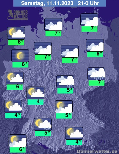 Die Temperaturen gehen bis Mitternacht auf Werte um 8 Grad an der Nordseeküste und 4 Grad am Alpenrand zurück.