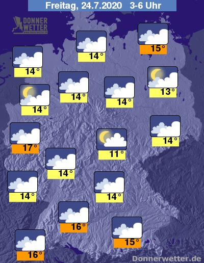Bis zu den Frühstunden kühlt die Luft auf laue 10 bis 17 Grad ab, am kühlsten wird es dabei in einigen Mittelgebirgstälern, am mildesten bleibt es in den Ballungsgebieten des Westens, sowie im Breisgau.