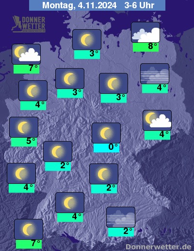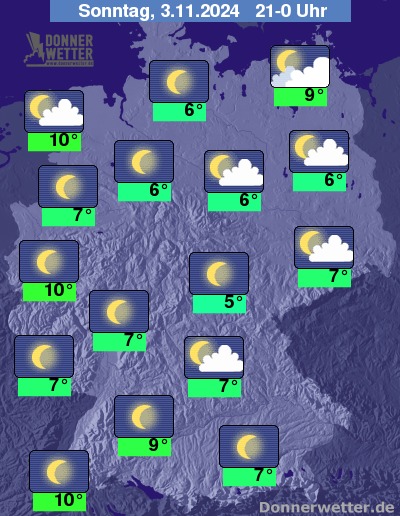 In der Nacht zum Montag zeigt sich der Himmel über dem Nordosten stark bewölkt, es bleibt aber meist trocken. In den übrigen Landesteilen ist es sternenklar oder nur gering bewölkt, später kann sich lokal Nebel oder Hochnebel bilden.