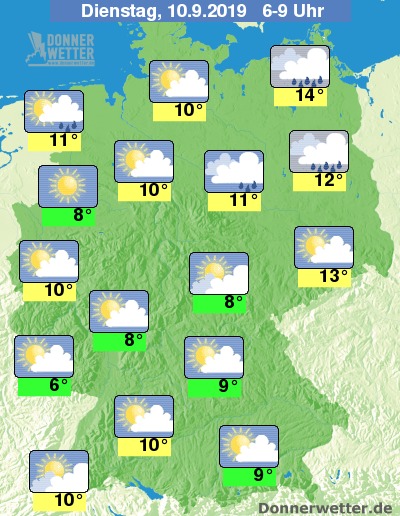 Im Nordosten weiter Regen, Tiefstwerte um 12 bis 7 Grad.