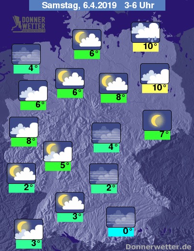 In der Südhälfte kühlt die Luft bis zu den Frühstunden auf 0 bis 5 Grad ab und es kann stellenweise leichten Frost geben. Im Nordosten bleibt es mit 6 bis 10 Grad milder.