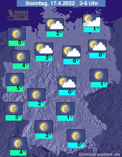 In der Nacht zum Sonntag zeigt sich der Himmel sternenklar oder locker bewölkt, lediglich im Ostseeumfeld sind gebietsweise einige Wolken möglich. Es bleibt landesweit trocken bei Tiefstwerten von 5 Grad in Cuxhaven und etwa 0 Grad in Erfurt.