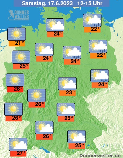 Heute Nachmittag ist es verbreitet heiter oder sonnig, hier und da bilden sich auch ein paar Quellwolken. Im Osten und Nordosten ziehen zum Teil dichte Wolken auf, dabei bilden sich einzelne Schauer, örtlich sind auch Gewitter möglich. Im übrigen Land bleibt es trocken bei Werten von 21 Grad an der Nordsee und rund 28 Grad im Rheinland.