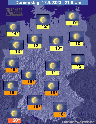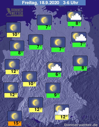 Bis zu den Frühstunden kühlt die Luft ab auf 6 bis 12 Grad, lediglich im Breisgrau bleibt es mit 12 bis 15 Grad noch etwas milder. In der Lüneburger Heide, sowie in einigen nördlichen Mittelgebirgstälern ist leichter Bodenfrost nicht ausgeschlossen.