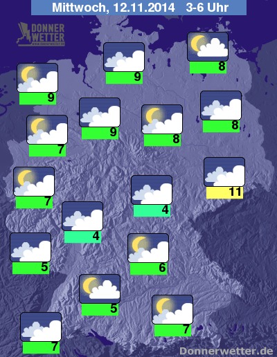 In der folgenden Nacht ist der Himmel verbreitet aufgelockert bis stark bewölkt. In Mecklenburg-Vorpommern ist es auch häufig noch locker bewölkt. Dazu fällt in der Norddeutschen Tiefebene hier und da etwas Regen oder Sprühregen, sonst bleibt es weitgehend trocken. Bis zum Morgen bildet sich stellenweise Nebel oder Hochnebel. Die Temperatur sinkt auf teils sehr milde 11 Grad in der Lausitz und bis 4 Grad am Odenwald.