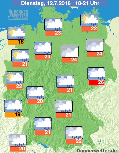 Heute Nachmittag zeigt sich im Norden und Westen neben zeitweise dichten Wolken auch die Sonne, jedoch bilden sich hier einzelne Schauer und auch mögliche Gewitter. Im übrigen Bundesgebiet ist es mehrheitlich bedeckt und im Süden fällt teils kräftiger und ergiebiger Regen. Im Osten bleibt es hingegen weitgehend trocken. Die Temperatur liegt bei 16 Grad in Ostfriesland und etwa 26 Grad in der Lausitz.