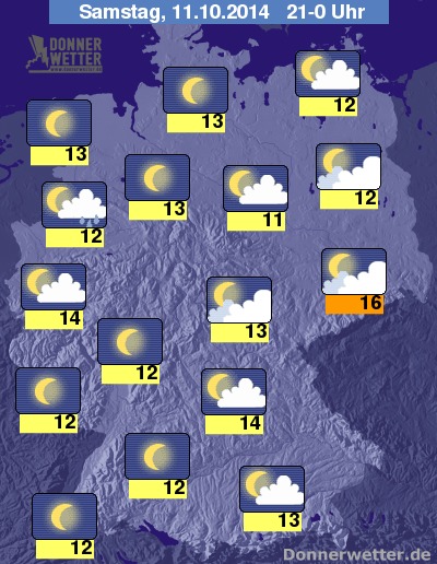 Heute Abend ziehen besonders im Osten noch häufig dichte Wolken durch, dabei fällt aber nur noch gelegentlich etwas Regen, sonst reißt der Himmel verbreitet auf und es ist locker bewölkt oder auch sternenklar, dazu bleibt es meist trocken. Die Abendwerte liegen bei 16 Grad in Niederschlesien und etwa 12 Grad am Bodensee.