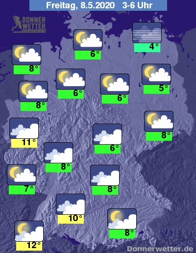 Die Temperaturen sinken in der Nacht auf Werte um 12 Grad am Oberrhein und um 4 Grad an der Ostseeküste.