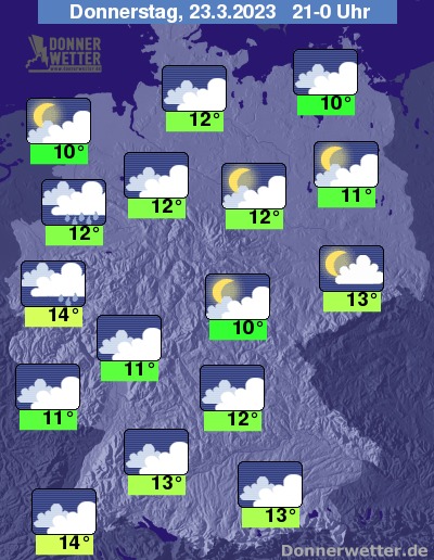 In den späten Abendstunden zeigt sich der Himmel meist stark bewölkt oder bedeckt. Von Westen her sind im Verlauf teils schauerartige Regenfälle möglich, die in den frühen Morgenstunden ostwärts ziehen. Überwiegend trocken bleibt es in den südlichen Landesteilen.