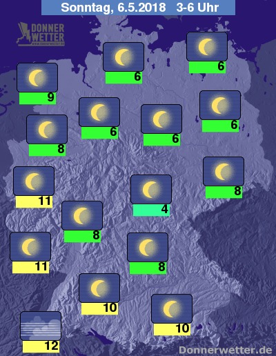 In der bevorstehenden Nacht funkeln über dem gesamten Bundesgebiet die Sterne von einem weitgehend wolkenlosen Nachthimmel, dazu bleibt es natürlich trocken. Die Temperatur sinkt auf 12 Grad in Freiburg und etwa 4 Grad im Thüringer Becken.
