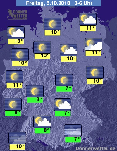 In der Nacht ist es in der Nordhälfte zumeist noch bewölkt, im Ostseeumfeld können auch einzelne Schauer fallen. Später klart es hier aber regional auch auf. In den übrigen Landesteilen bleibt der Himmel meist sternenklar, entlang der Donau sowie am Alpenrand kann sich stellenweise auch Nebel bilden.