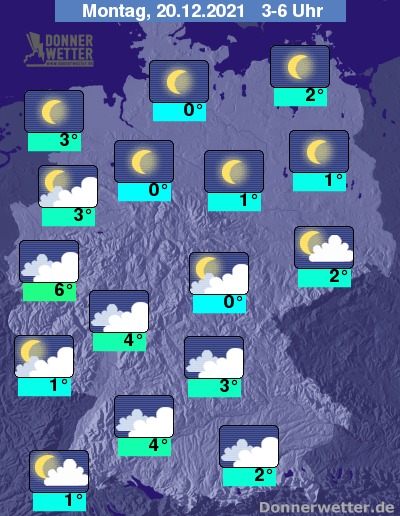In der Nacht zum Montag klart der Himmel zunächst im Norden, im weiteren Verlauf über der Nordhälfte des Landes auf. Weiter nach Süden hin bleibt es bis zum Morgen zumeist stark bewölkt, hier und da und vor allem am Alpenrand lockert der Himmel auf. Es bleibt landesweit trocken. Die Temperatur sinkt auf 6 Grad in Köln und etwa 0 Grad in Hamburg.