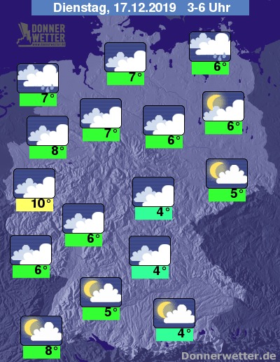 Im weiteren Verlauf nimmt die Bewölkung dann auch in den mittleren Landesteilen wieder zu, nur südlich der Donau sowie über Brandenburg und Sachen dominiert lockere oder aufgelockerte Bewölkung. An den Küsten kann in den frühen Morgenstunden etwas Regen fallen, sonst bleibt es meist trocken.