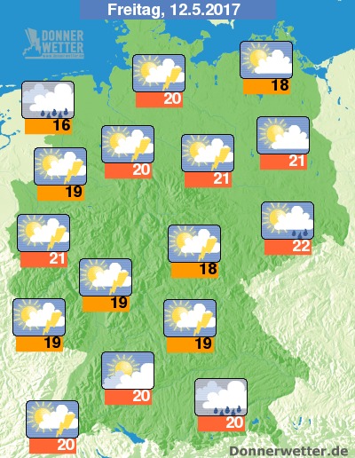Auch am Freitag bestimmen die schwül-warmen Luftmassen unser Wetter. Neben längeren sonnigen Abschnitten ist fast landesweit immer wieder mit teils kräftigen Schauern und Gewittern mit Hagel und Sturmböen zu rechnen. Weitgehend trocken bleibt es lediglich im äußersten Nordosten.
