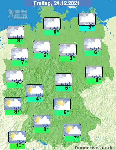 An Heiligabend bleibt es über Deutschland verbreitet bedeckt oder neblig-trüb, nur hier da kann es auch mal auflockern. Es fällt gebietsweise Regen bei Werten von 2 Grad in Vorpommern und bis 10 Grad am Oberrhein.