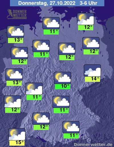 In der Nacht zum Donnerstag zeigt sich der Himmel über Deutschland verbreitet locker bis aufgelockert bewölkt. Hier und da bildet sich auch eine geschlossene Wolkendecke, dazu bleibt es trocken. Die Temperatur sinkt auf 15 Grad in Freiburg und etwa 10 Grad in Erfurt.