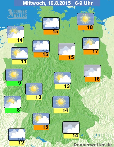 Am morgen wird das Wetter in den Gebieten rund um das Rheinland sonnig, selten zeigen sich Wolken. Im Schwarzwald kann es zu kleinen Regenfällen kommen. Im Osten zeigt sich nach langem Dauerregen wieder die Sonne vorallem an der Ostseeküste. Im Norden sind immernoch kleine Schauer Wolken bis hin zum Teutoburger Wald entlang unterwegs. Am Morgen gibt es Werte von kühlen 9 Grad C bis hin zu 18 Grad C.