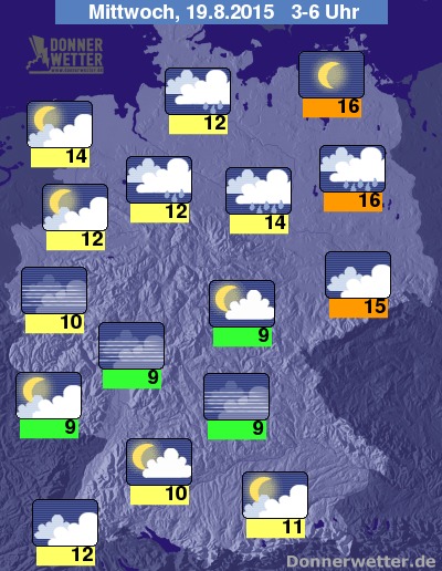 In den Regionen NRW, im Rheinland und im Mittelfranken ziehen in der Nacht auf den Mittwoch Nebelwolken auf. Der Süden des Landes ist meist mit Wolken bedeckt und, teilweise auch heiter. In Berlin und nähe Magdeburg sind weiterhin die Regenwolken am Himmel. An der Ostseeküste ist der Himmel klar. An der Nordseeküste und an der Weser sind mit kleinen Regenfällen zu rechnen. Die Temperaturen steigen in der späten Nacht von 9 Grad C bis auf 16 Grad C an der Küste der Ostsee.
