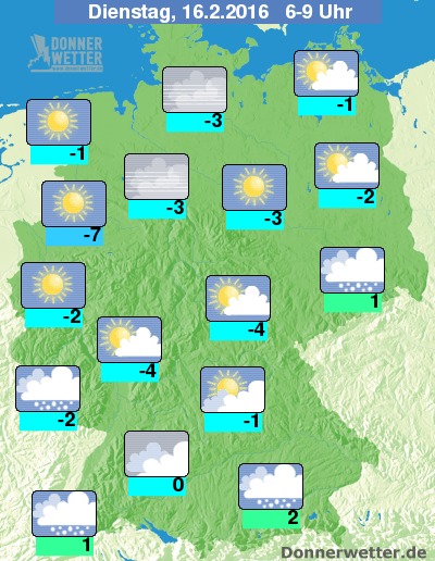 Der Dienstag startet häufig heiter oder sonnig, zwischen Nordseeküste und Teutoburger Wald kann sich stellenweise auch dichter Nebel halten. Vereinzelter Schneefall ist in den südlichen und östlichen Mittelgebirgen möglich. Die Temperaturen liegen am Morgen bei Tiefstwerten um -7 bis +2 Grad C.